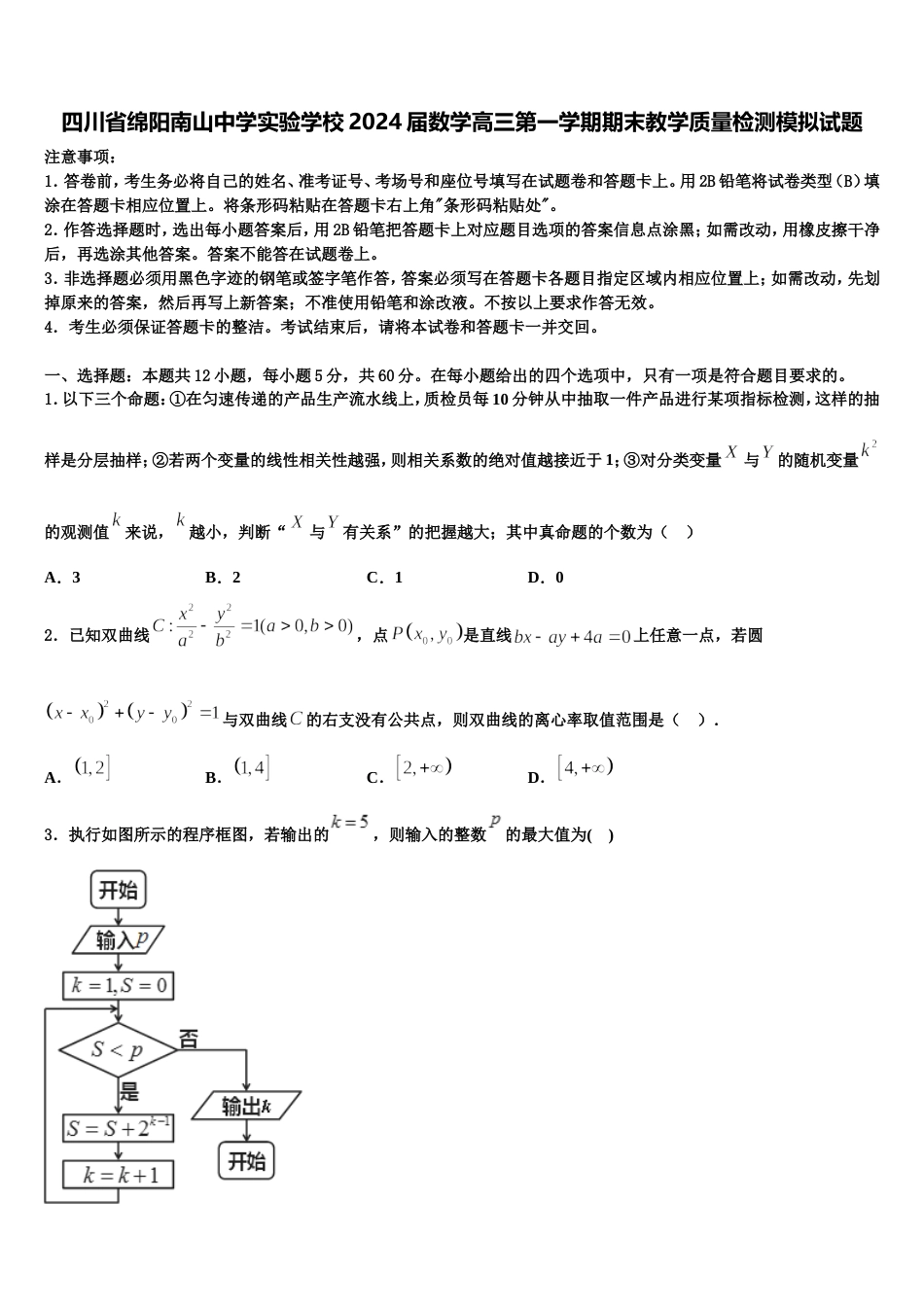 四川省绵阳南山中学实验学校2024届数学高三第一学期期末教学质量检测模拟试题含解析_第1页