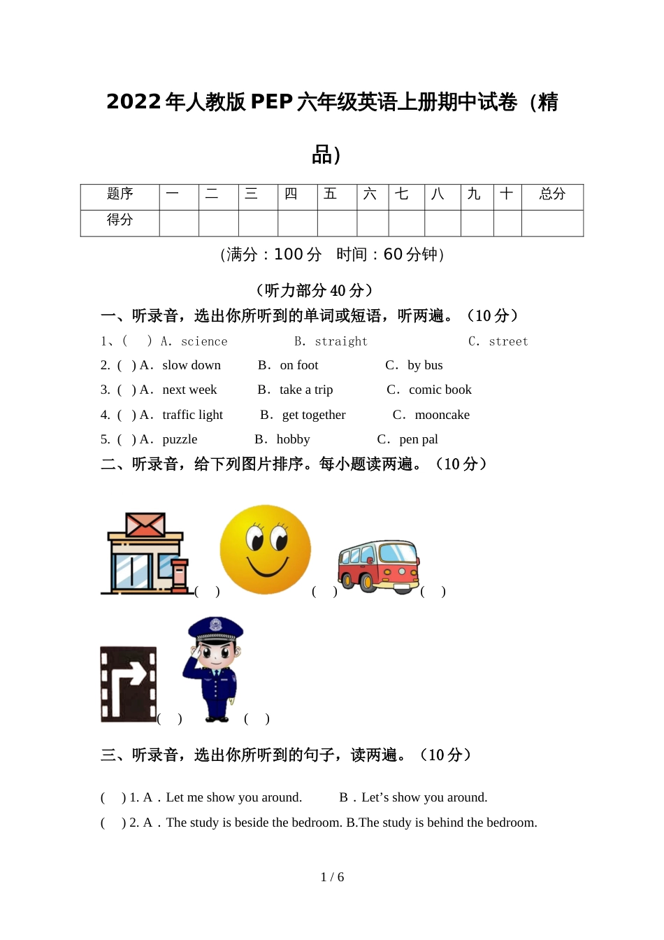 2022年人教版PEP六年级英语上册期中试卷(精品)题序一二三四五六七八九十总分得分(满分:100分时间:60分钟)(听力部分40分)一、听录音...