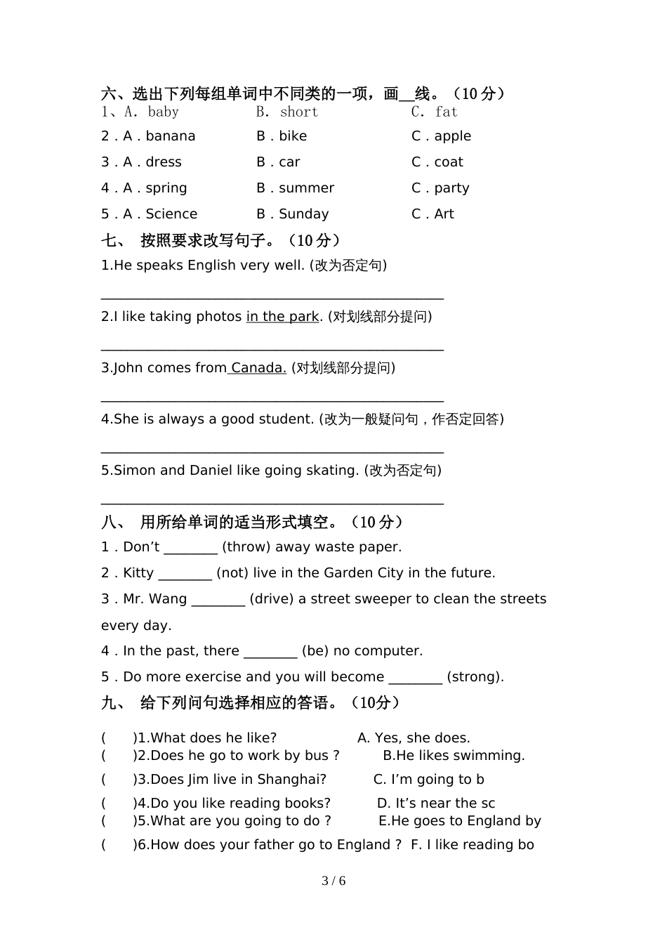 2021—2022年人教版六年级英语上册期中试卷(A4打印版)_第3页