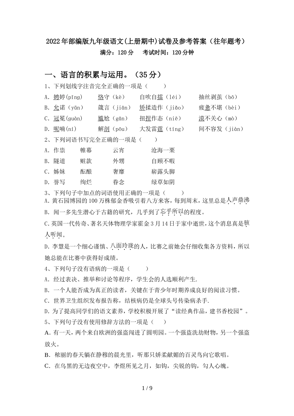 2022年部编版九年级语文(上册期中)试卷及参考答案(往年题考)满分:120分考试时间:120分钟一、语言的积累与运用。(35分)1、下列划线字...