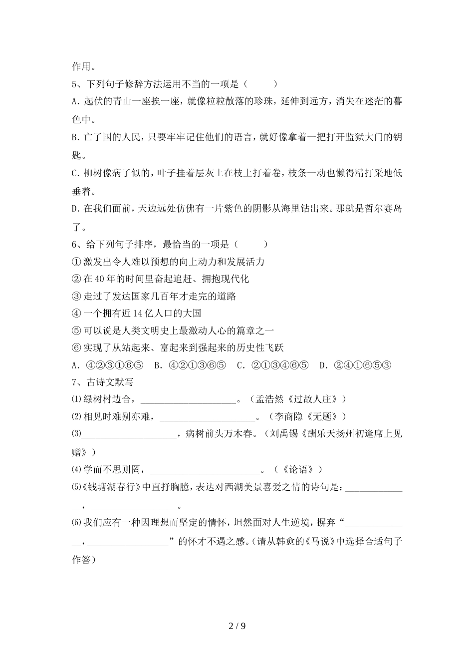 2022年部编版九年级语文上册期中考试及答案【全面】_第2页