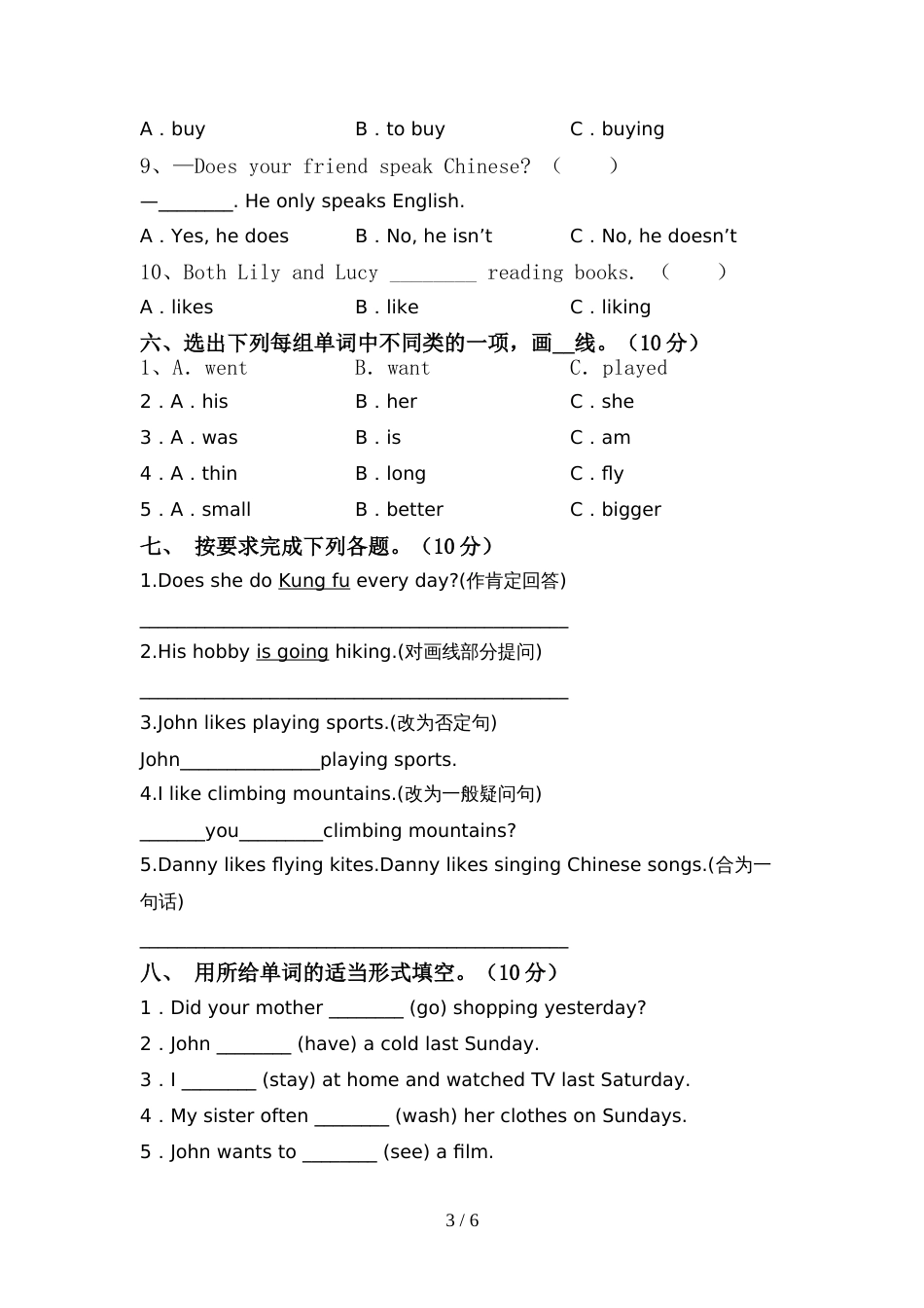 2022年人教版PEP六年级英语(上册)期中阶段测试卷及答案_第3页