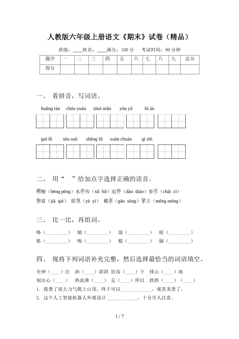 人教版六年级上册语文《期末》试卷(精品)_第1页