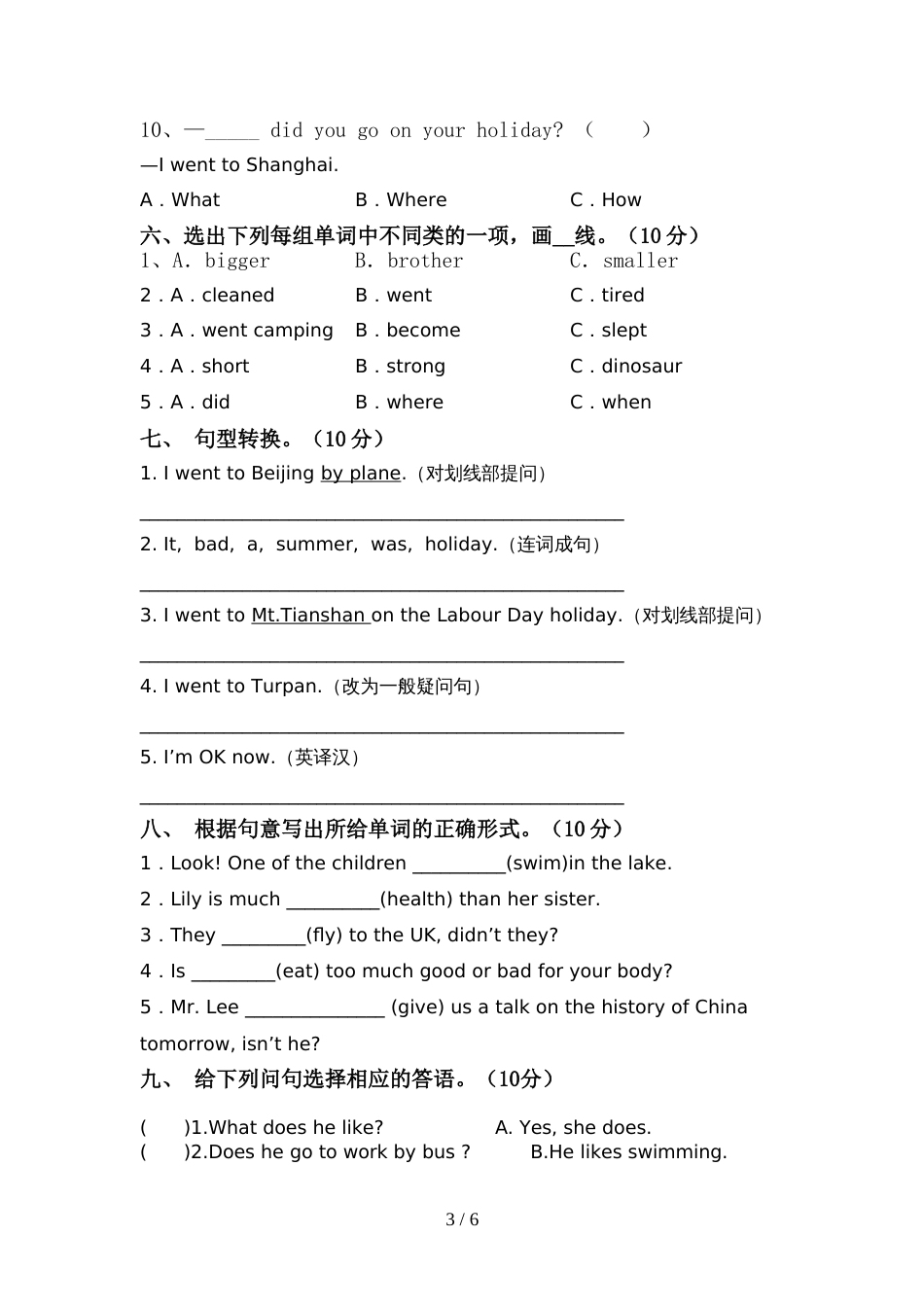 PEP六年级英语上册期中考试卷(汇总)_第3页