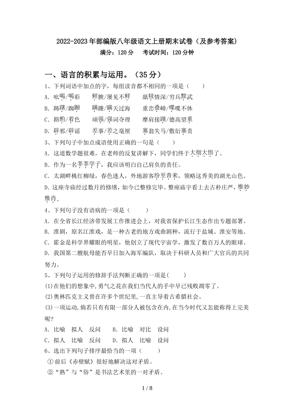 2022-2023年部编版八年级语文上册期末试卷(及参考答案)_第1页