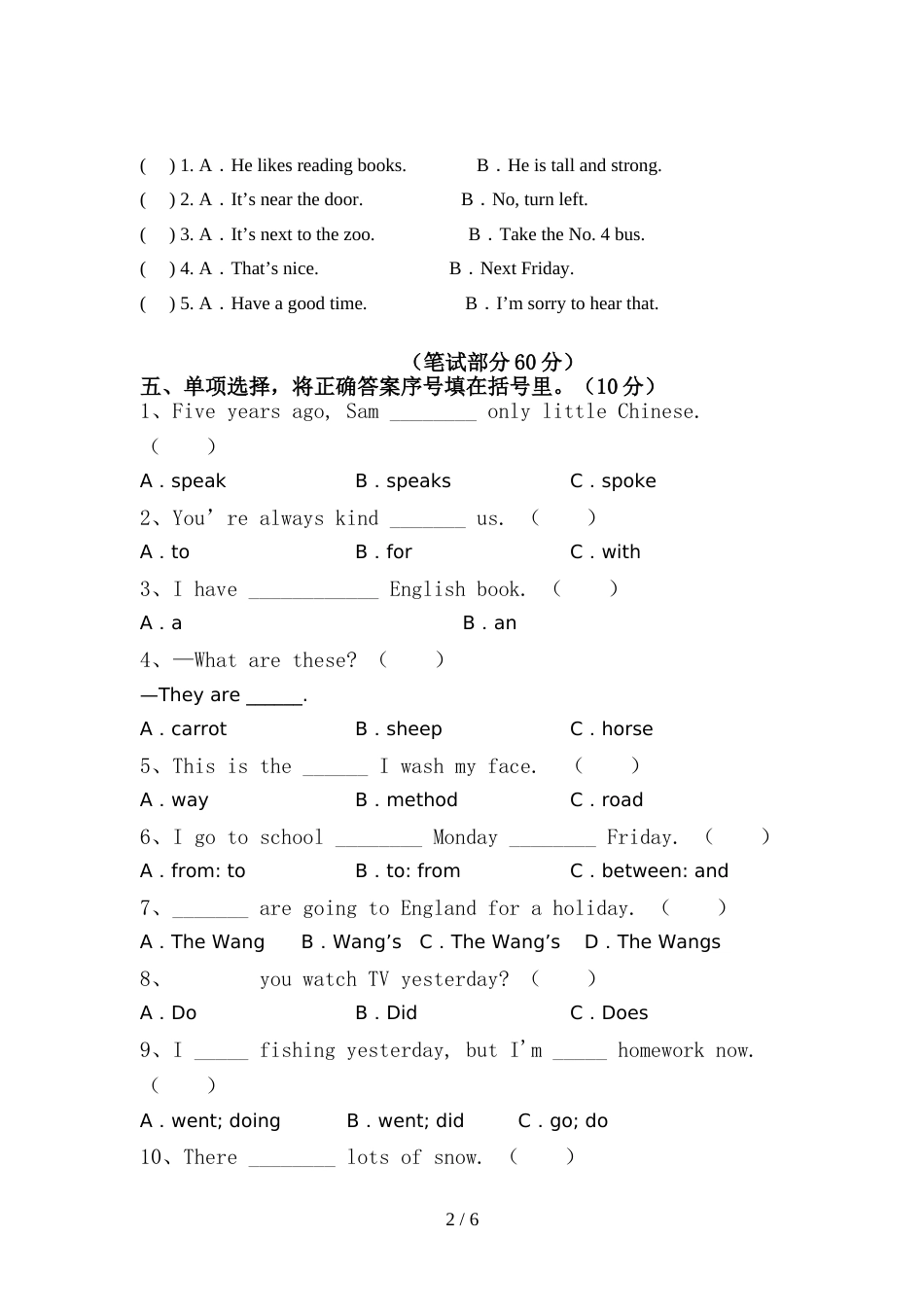 部编版六年级英语上册期中测试卷(含答案)_第2页