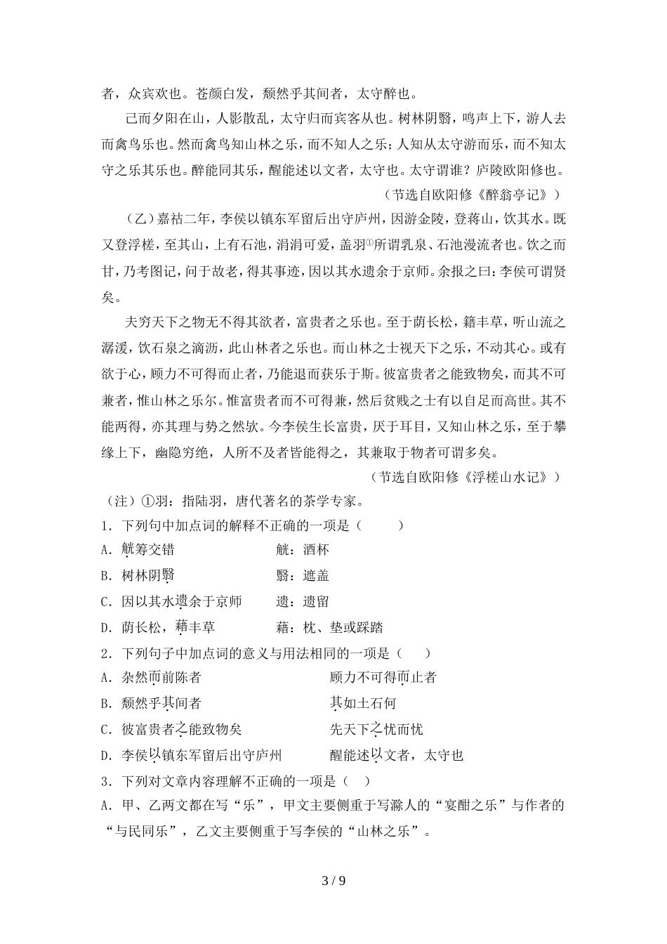 人教版九年级语文(上册期中)检测卷及答案_第3页