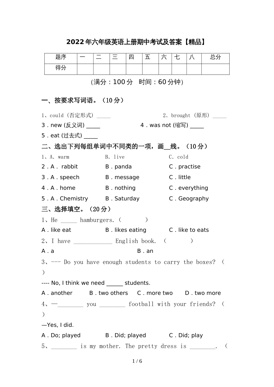 2022年六年级英语上册期中考试及答案【精品】题序一二三四五六七八总分得分(满分:100分时间:60分钟)一、按要求写词语。(10分)1、coul...