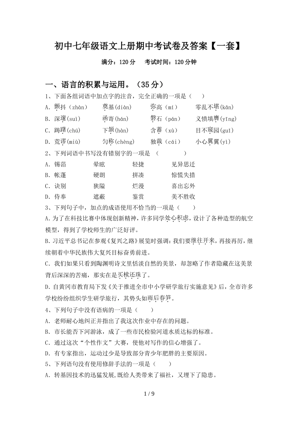 初中七年级语文上册期中考试卷及答案【一套】满分:120分考试时间:120分钟一、语言的积累与运用。(35分)1、下面各组词语中加点字的注音...