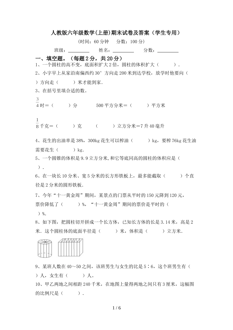 人教版六年级数学(上册)期末试卷及答案(学生专用)_第1页