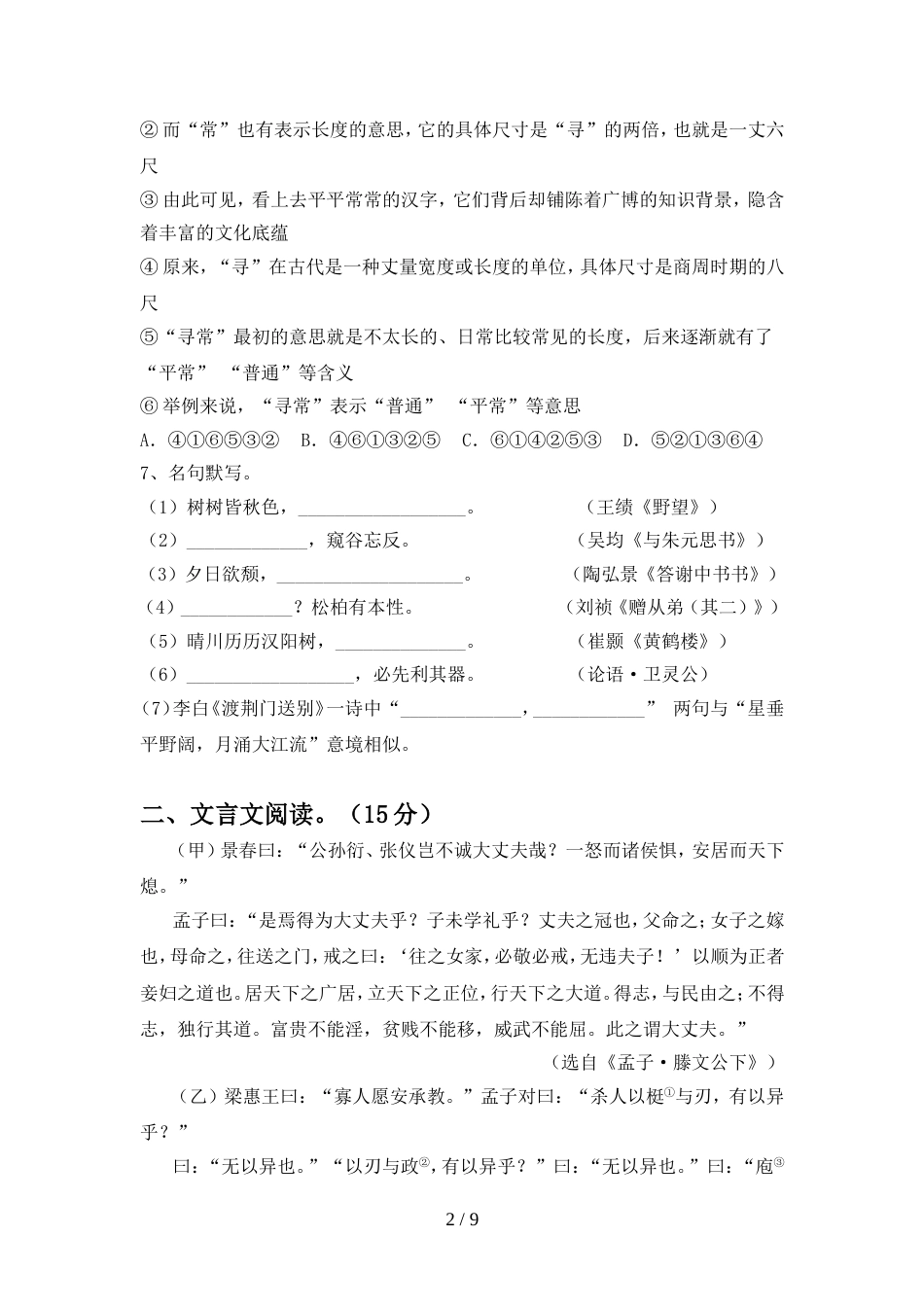 2022-2023年部编版八年级语文上册期末考试卷【参考答案】_第2页