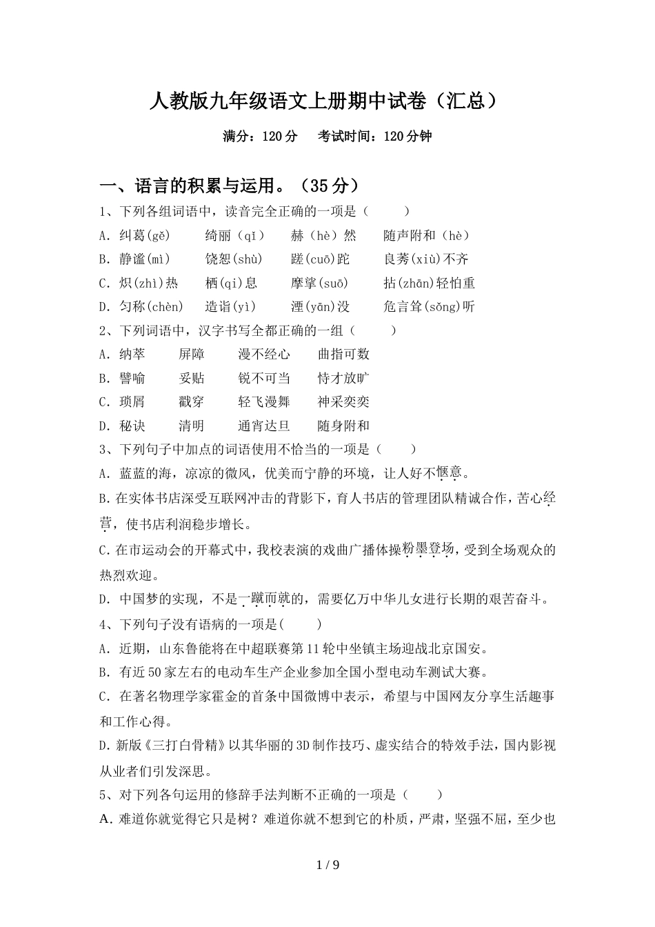 人教版九年级语文上册期中试卷(汇总)_第1页