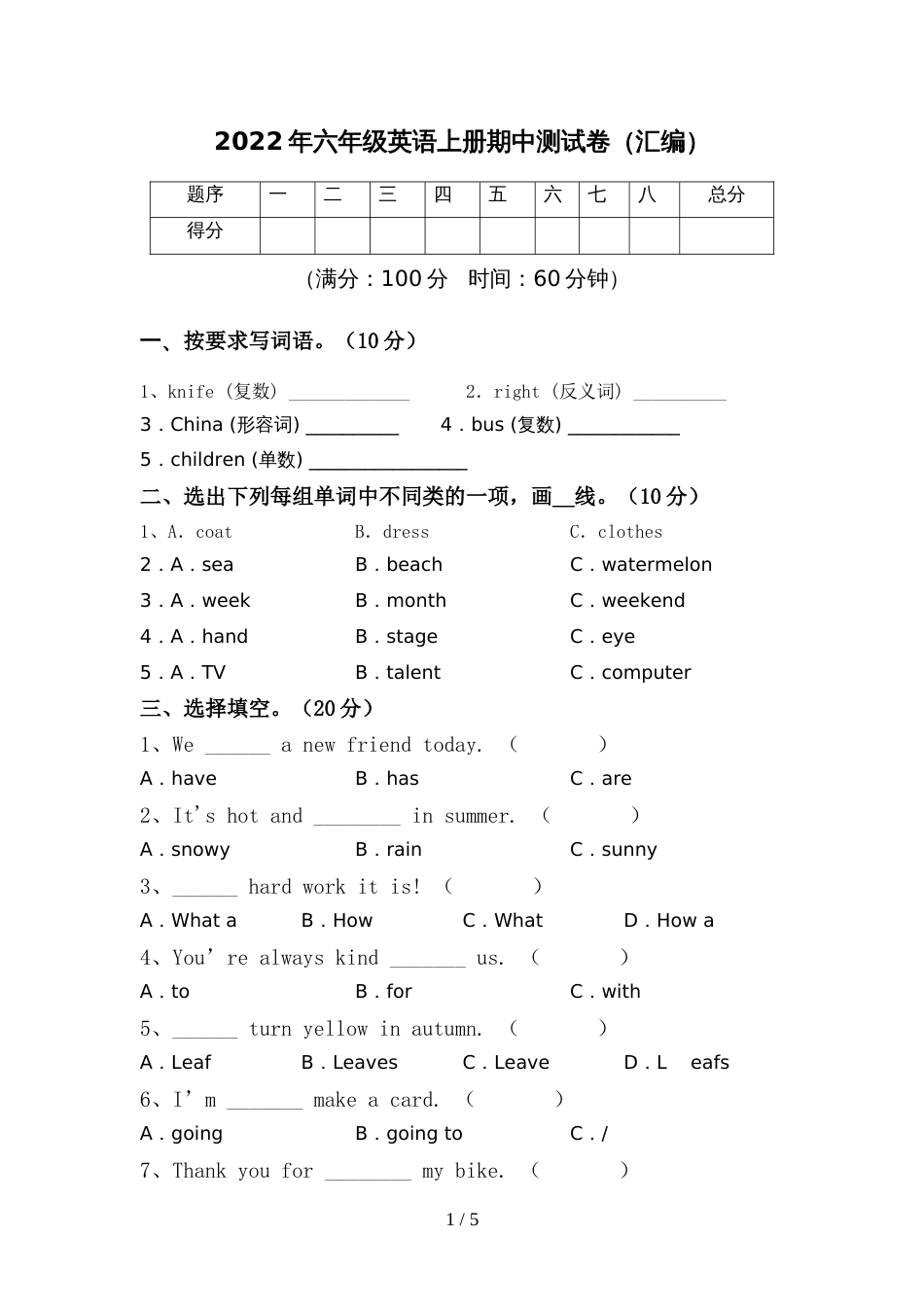 2022年六年级英语上册期中测试卷(汇编)题序一二三四五六七八总分得分(满分:100分时间:60分钟)一、按要求写词语。(10分)1、knife(复...