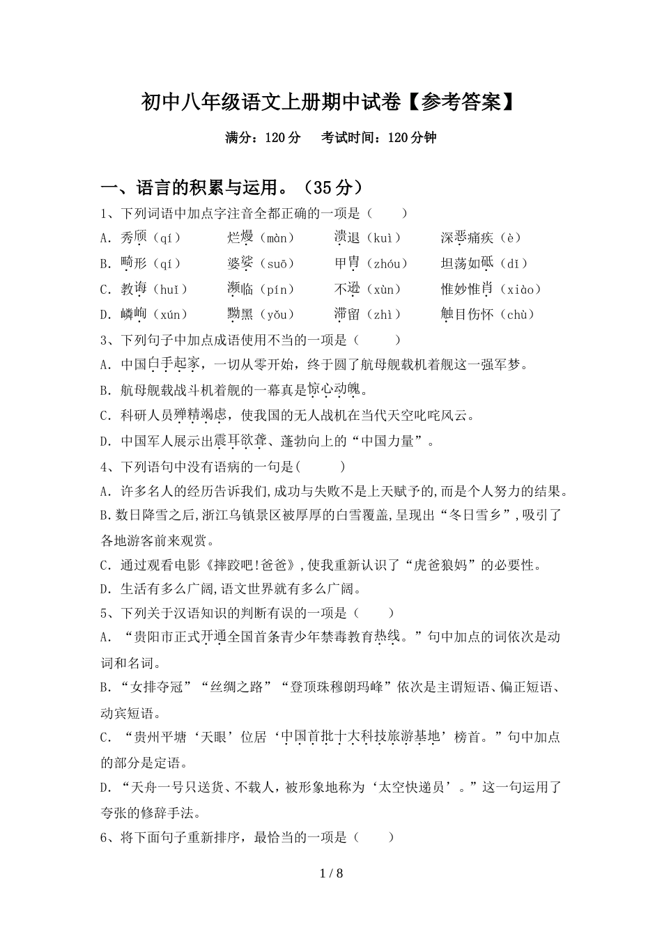 初中八年级语文上册期中试卷【参考答案】满分:120分考试时间:120分钟一、语言的积累与运用。(35分)1、下列词语中加点字注音全都正确的...
