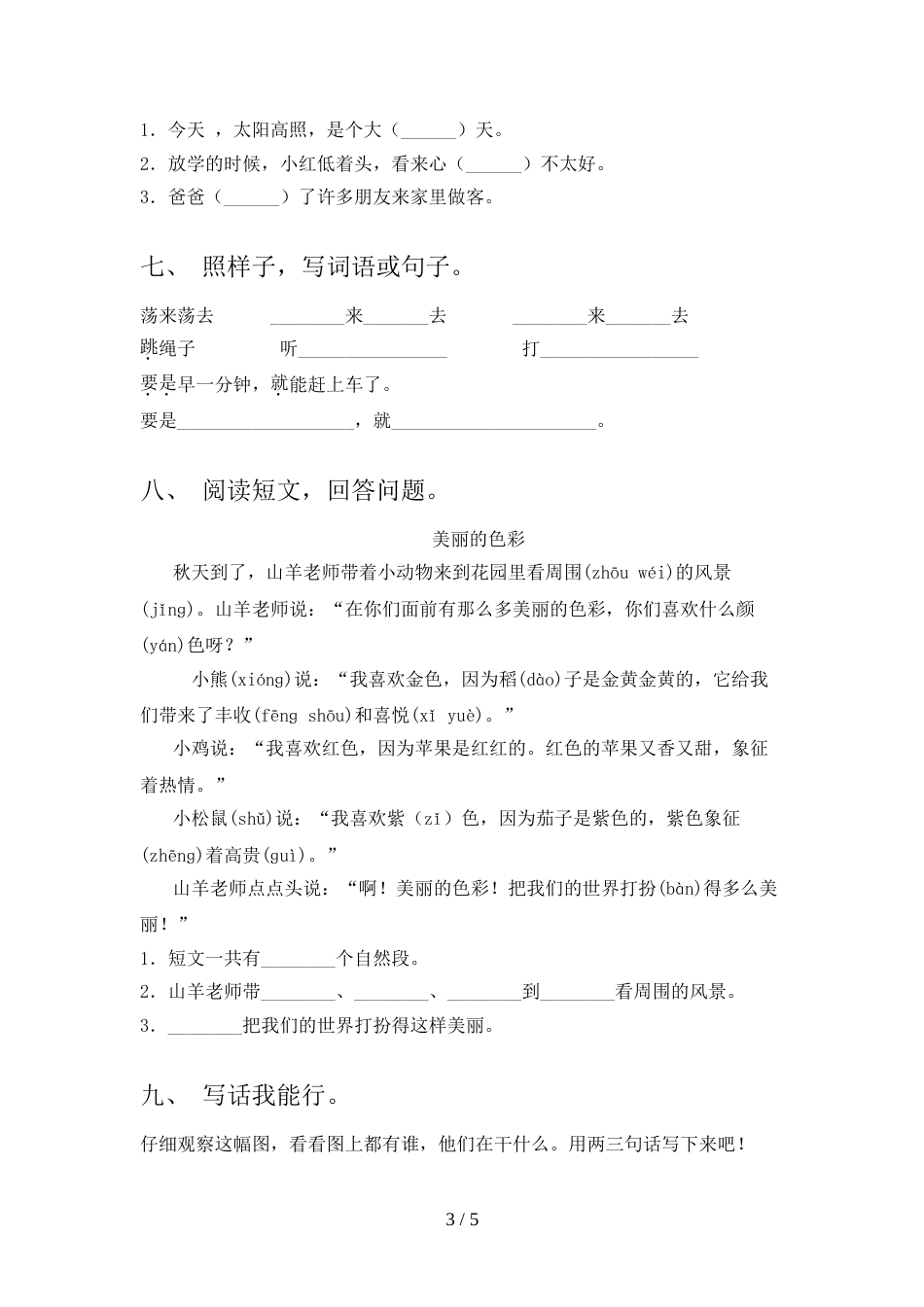部编人教版一年级语文上册期末考试卷附答案班级:姓名:满分:100分考试时间:90分钟题序一二三四五六七八九总分得分一、我会填。看图,给...