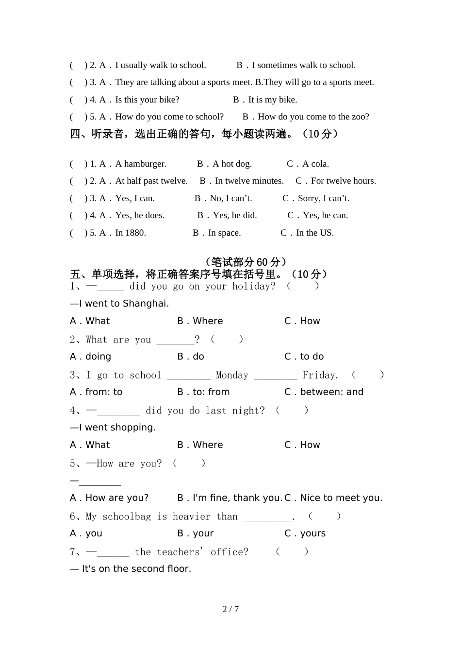 2022年北京版六年级英语上册期中考试题及答案【完整版】_第2页
