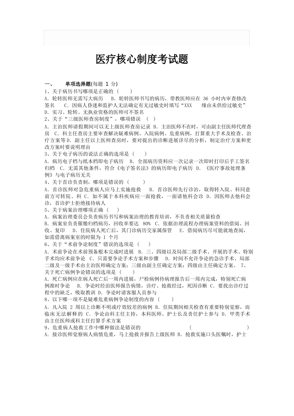 医疗核心制度考试题一、单项选择题(每题1分)1、关于病历书写哪项是正确的()A.轮转医师无需写大病历B.轮转医师书写的病历,带教医师应在36...