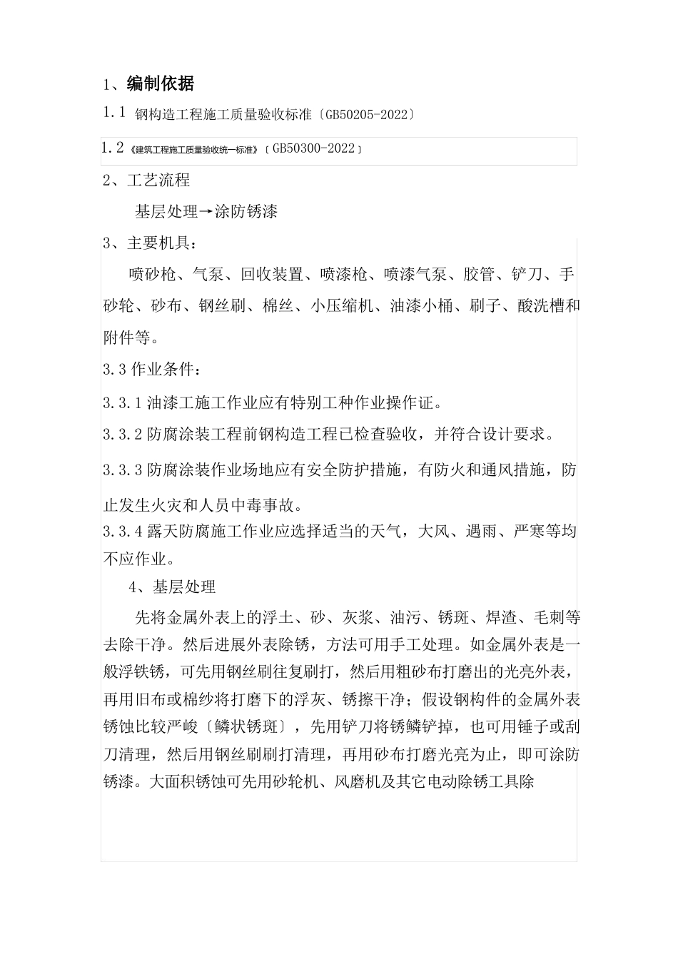 1.2《建筑工程施工质量验收统一标准》〔GB50300-2022〕1、编制依据1.1钢构造工程施工质量验收标准〔GB50205-2022〕2、工艺流程基层处理→涂...