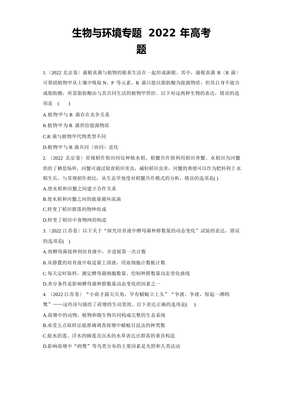 生物与环境专题2022年高考题1.〔2022北京卷〕菌根真菌与植物的根系生活在一起形成菌根。其中,菌根真菌R〔R菌〕可帮助植物甲从土壤中吸取N...