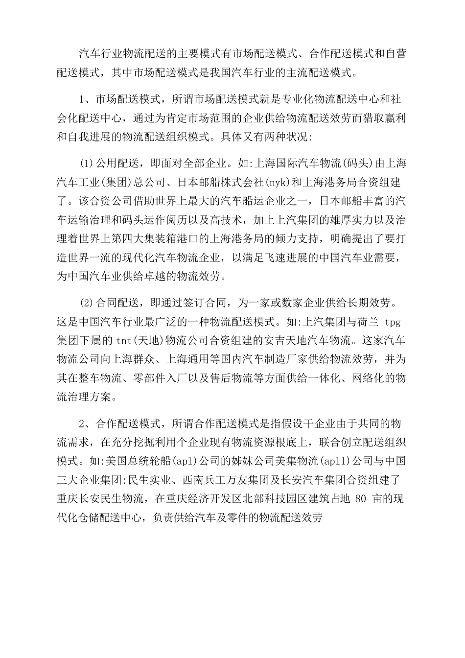 汽车行业分析报告范文汽车行业分析报告〔一〕一、汽车物流定义汽车物流是指汽车供给链上原材料、零部件、整车以及售后配件在各个环节之间的...