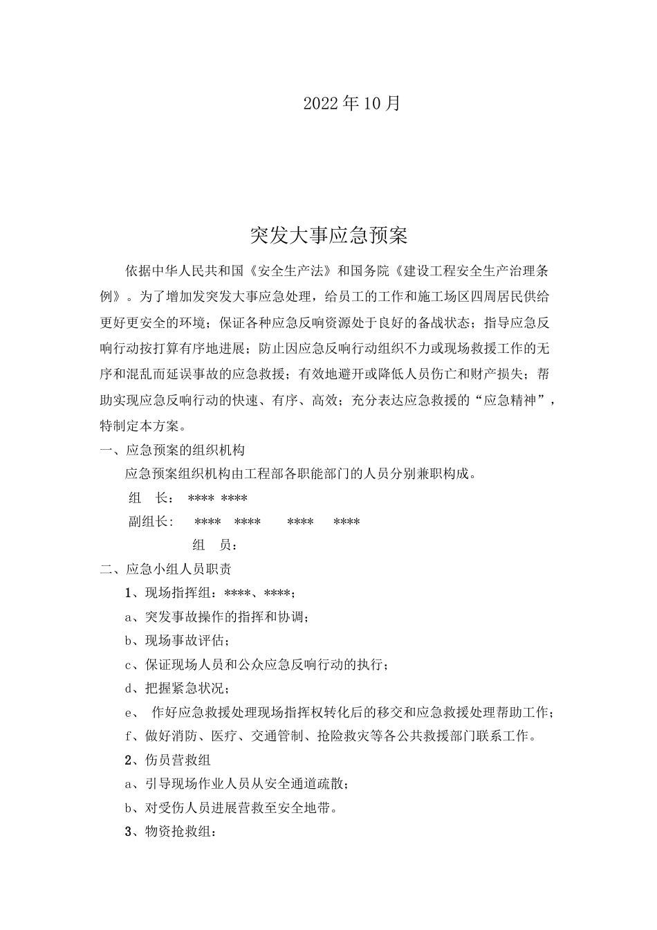 突发事件应急预案编制:****审核:****审批:********局集团****高速大路****合同段工程经理部2022年10月突发大事应急预案依据中华人民共和...