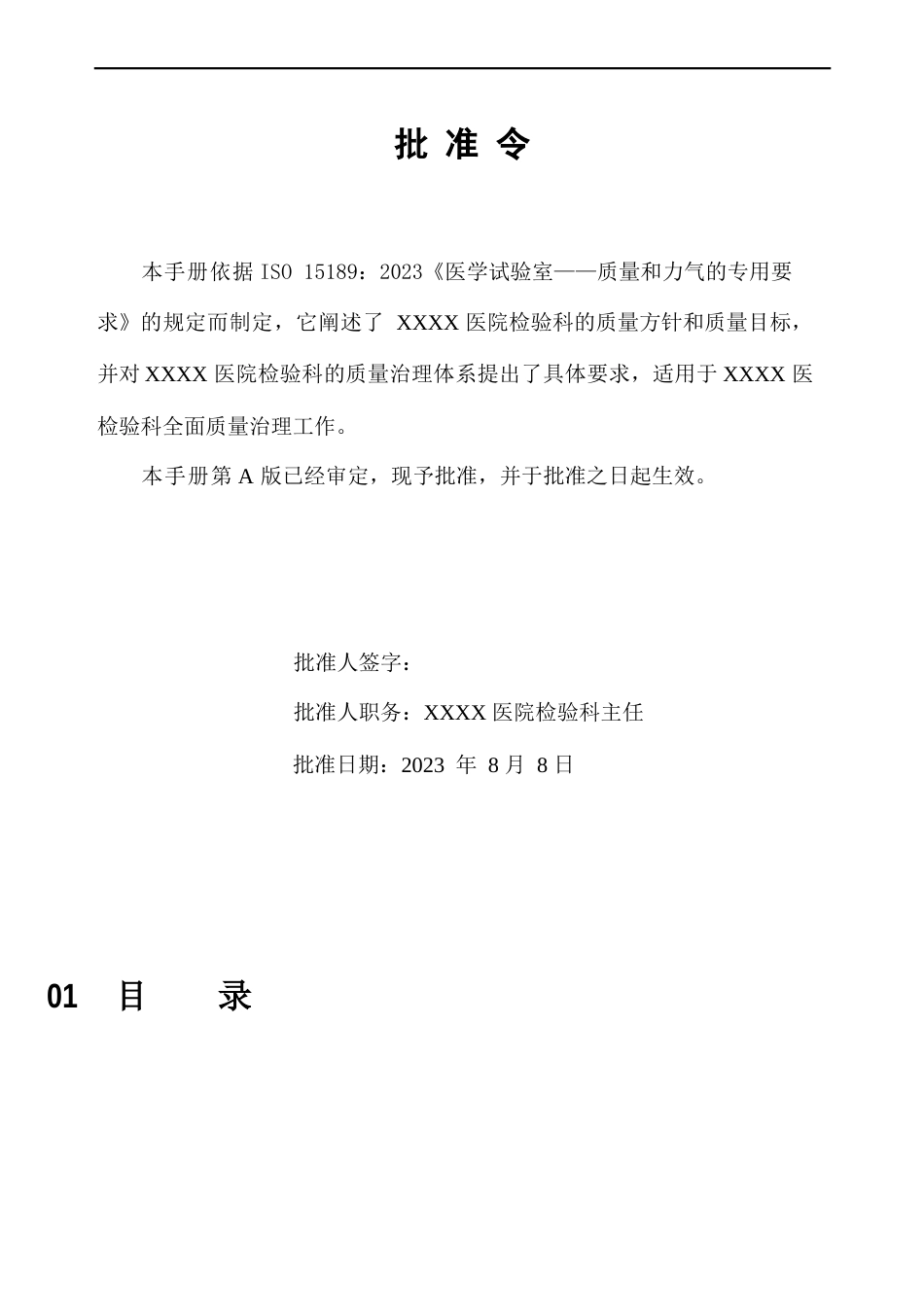 质量手册文件编号:番禺区南村-1-2023第A版依据ISO15189:2023《医学试验室—质量和力气的专用要求》编制生效日期:2023年6月1日XXXX医院检...