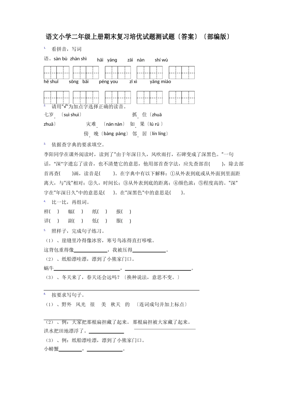 语文小学二年级上册期末复习培优试题测试题〔答案〕〔部编版〕1.看拼音,写词语。sànbùzhànshìhǎiyánɡzāinànshíwùhēshuǐsōng...