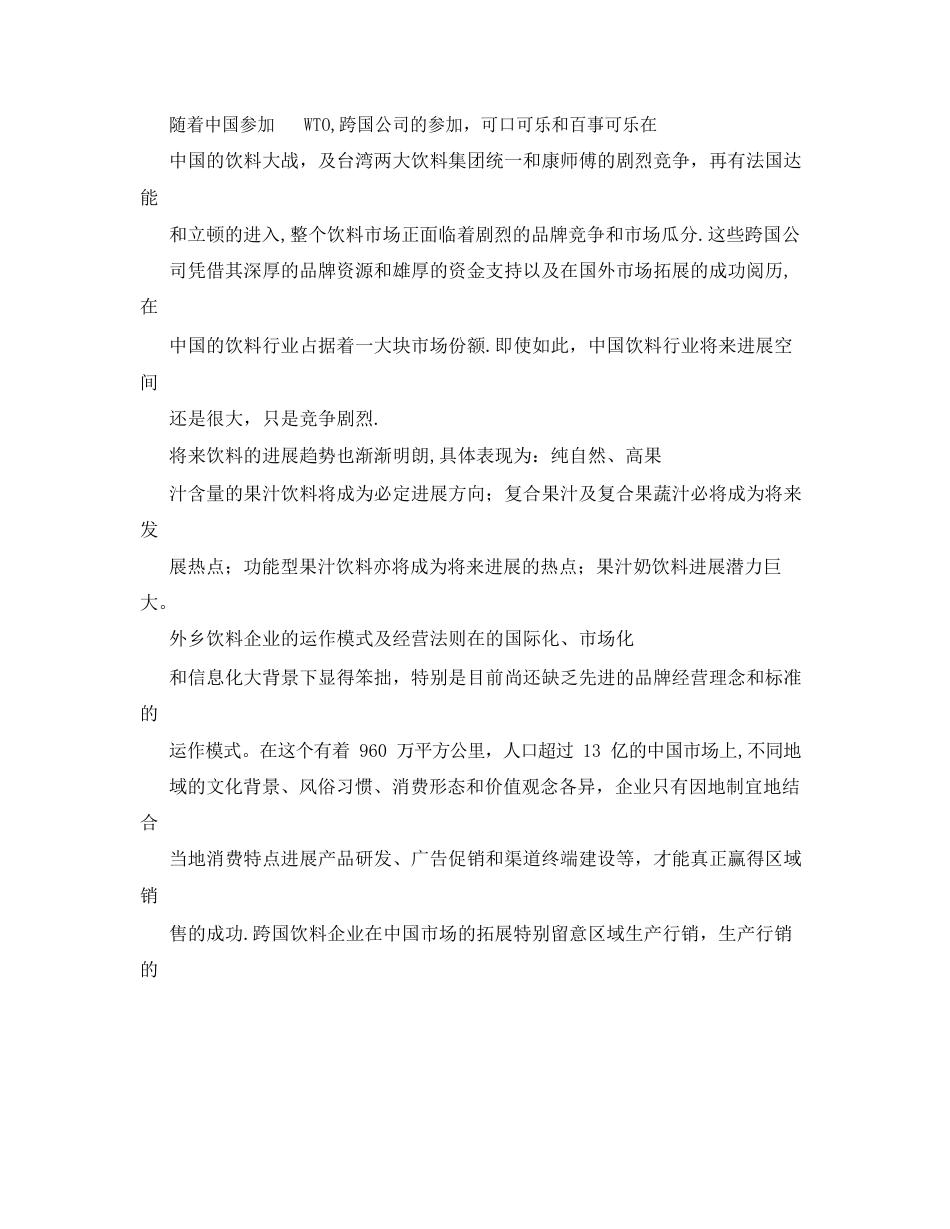 娃哈哈市场营销筹划书基于目前中国饮料行业竞争格局剧烈,进入全面竞争时代,碳酸饮料、水、茶、果汁、含乳饮料五大领域剧烈拼杀。娃哈哈在...