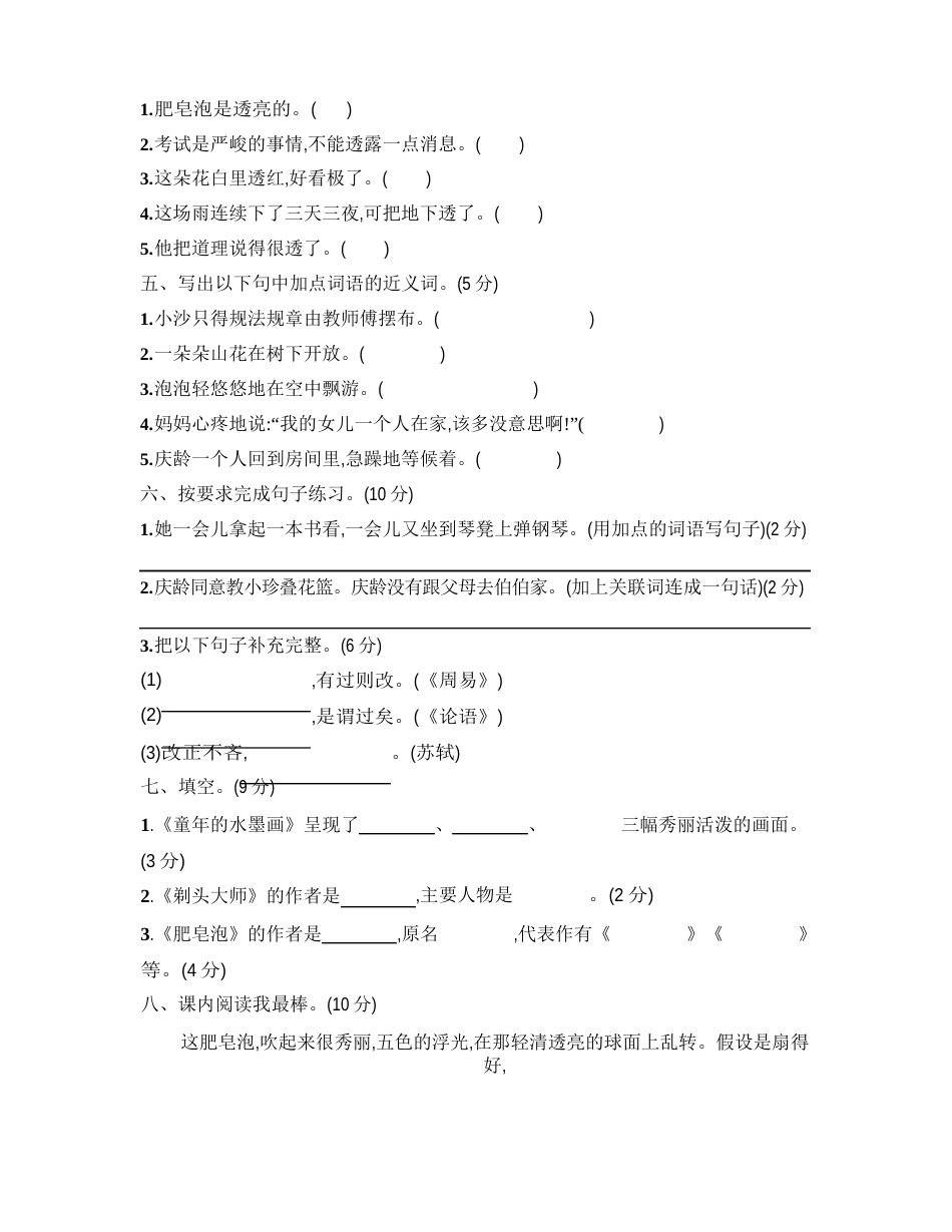 题号一二三四五六七八九十总分得分第六单元评价测试卷(时间:60分钟分值:100分)一、读拼音,写词语。(8分)二、比一比,再组词。(5分)三、用“...