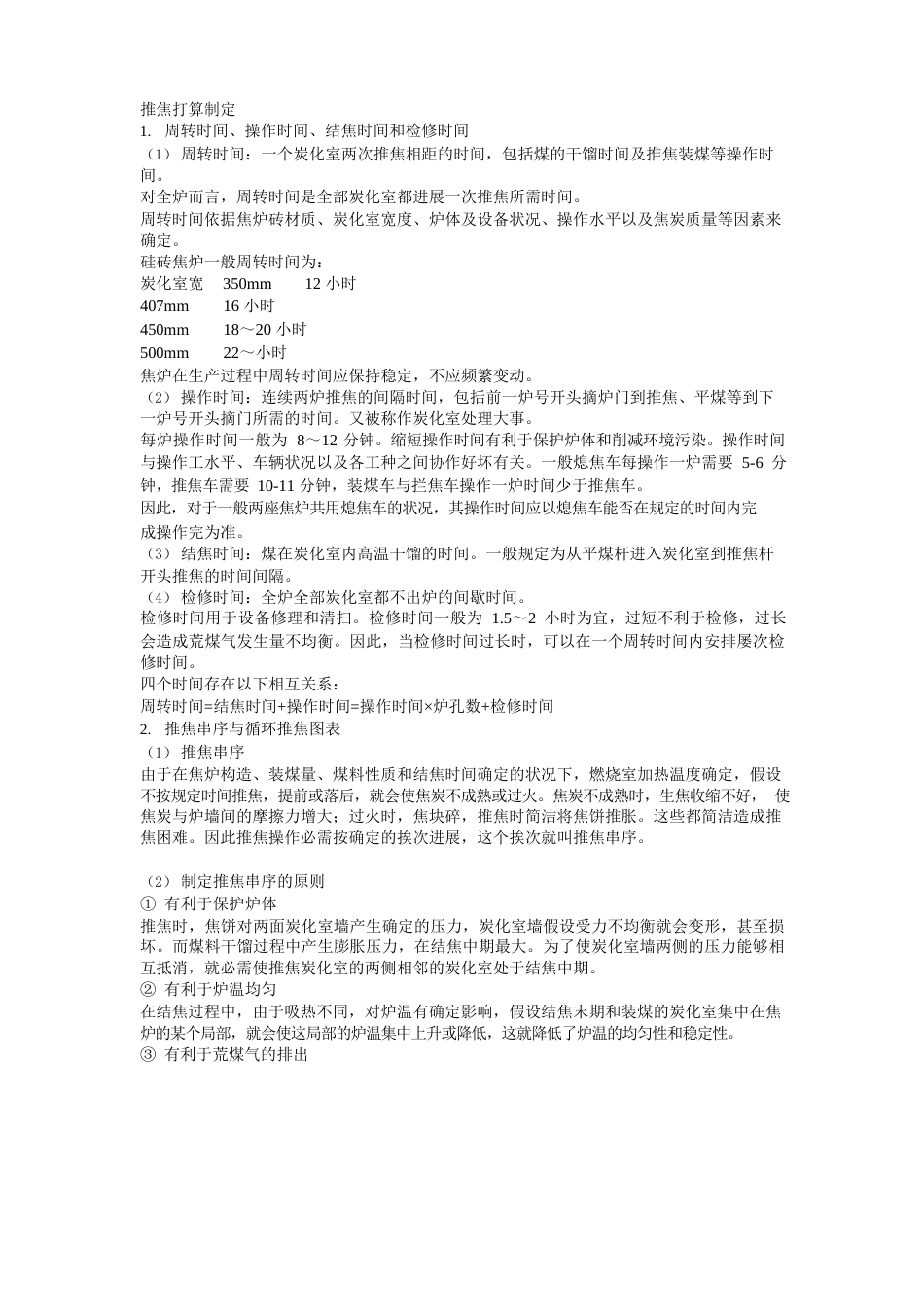 推焦打算制定1.周转时间、操作时间、结焦时间和检修时间(1)周转时间:一个炭化室两次推焦相距的时间,包括煤的干馏时间及推焦装煤等操作...