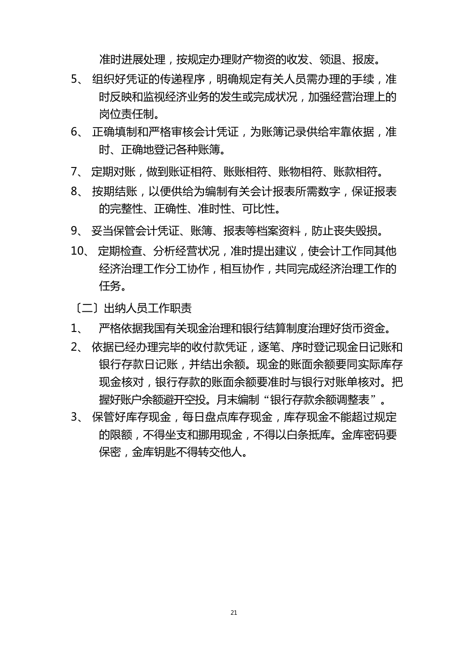 21工程有限责任公司财务部治理制度第一条财务部工作职能岗位设置:会计、出纳。主要职能:1、处理公司的各项工程核算、资金调度、费用间控...