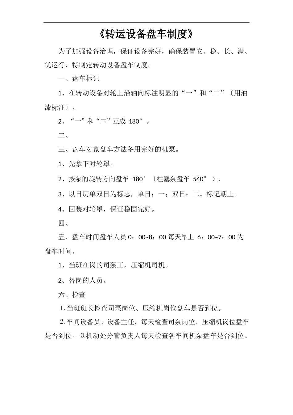 《转运设备盘车制度》为了加强设备治理,保证设备完好,确保装置安、稳、长、满、优运行,特制定转动设备盘车制度。一、盘车标记1、在转动...