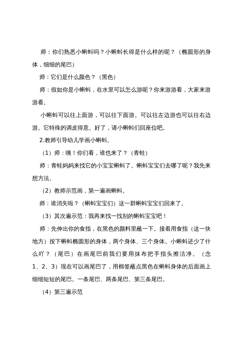 小班美术《快乐的小蝌蚪》教案【活动目标】1、学习用手指压印和直线添画的方法画出小蝌蚪。2、大胆作画,体验美术活动的欢乐。3、培育幼儿...