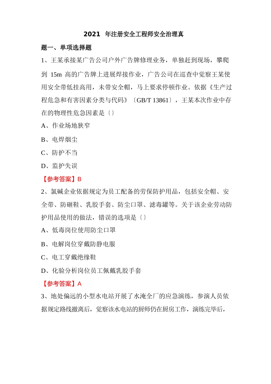 2021年注册安全工程师安全治理真题一、单项选择题1、王某承接某广告公司户外广告牌修理业务,单独赶到现场,攀爬到15m高的广告牌上进展焊接...