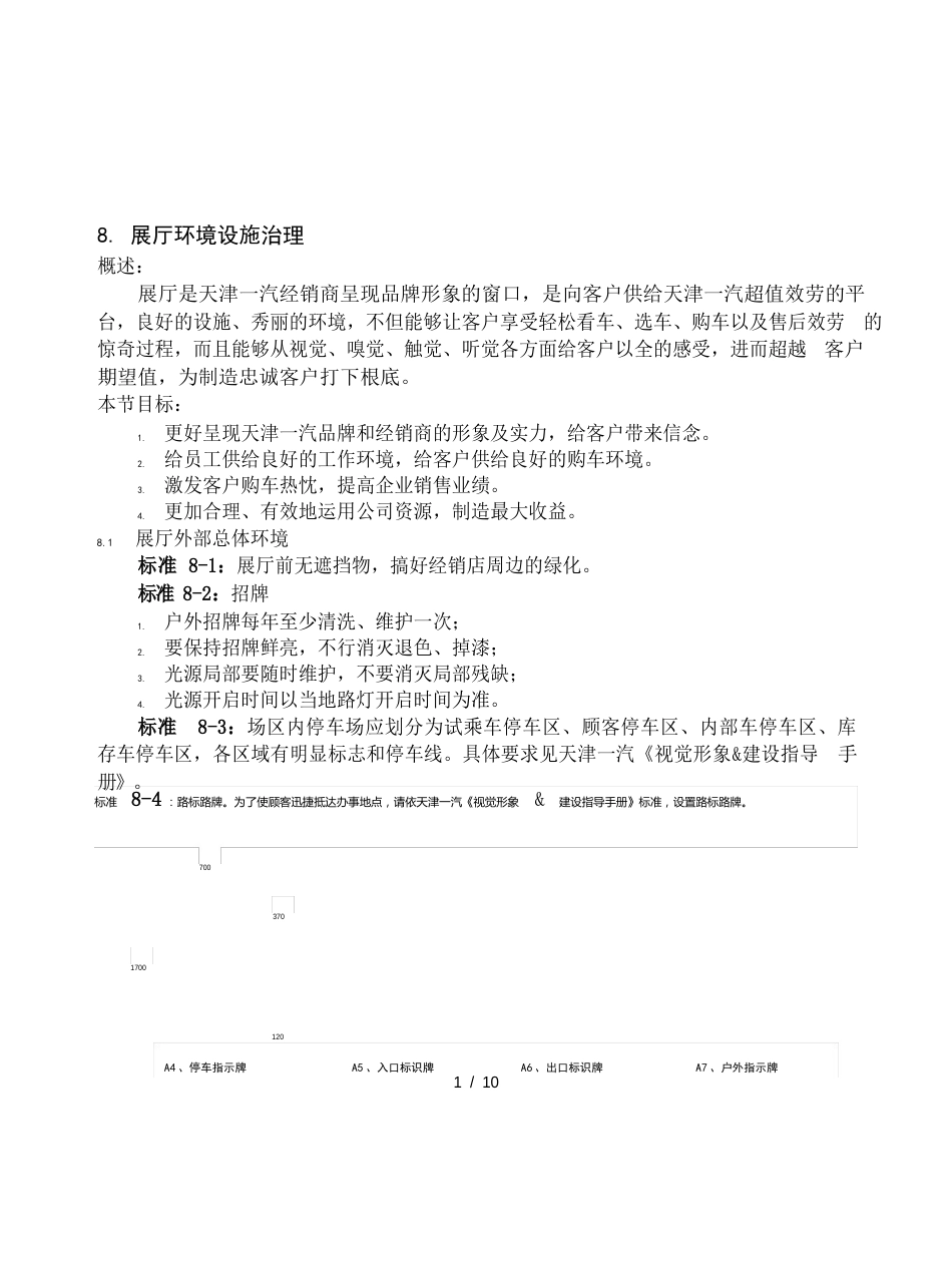 标准8-4:路标路牌。为了使顾客迅捷抵达办事地点,请依天津一汽《视觉形象&建设指导手册》标准,设置路标路牌。A4、停车指示牌A5、入口标识...