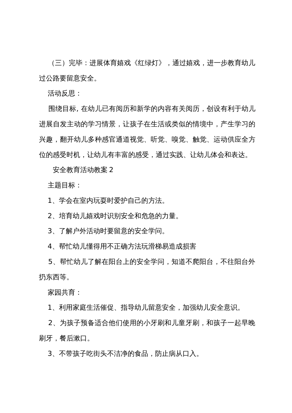 安全教育活动教案(通用12篇)活动目标:1、教育幼儿走在公路上要留意安全,初步培育幼儿的自我爱护意识。2、培育幼儿清楚的口语表达力量及...