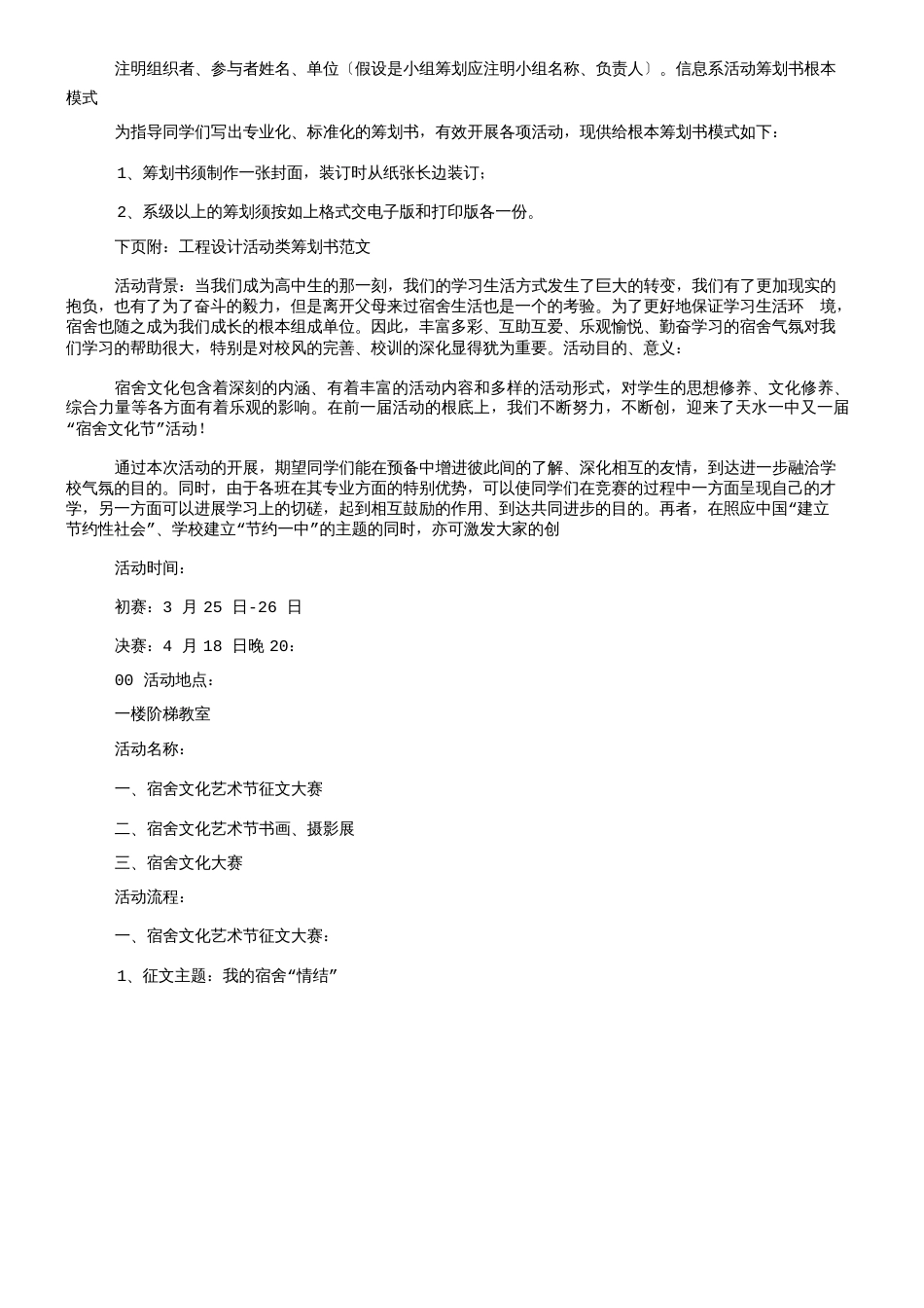 工程设计活动类筹划书格式一、筹划书名称尽可能具体的写出筹划书名称,如“天水一中xx活动筹划书”,置于页面中心。二、活动背景:这局部内...