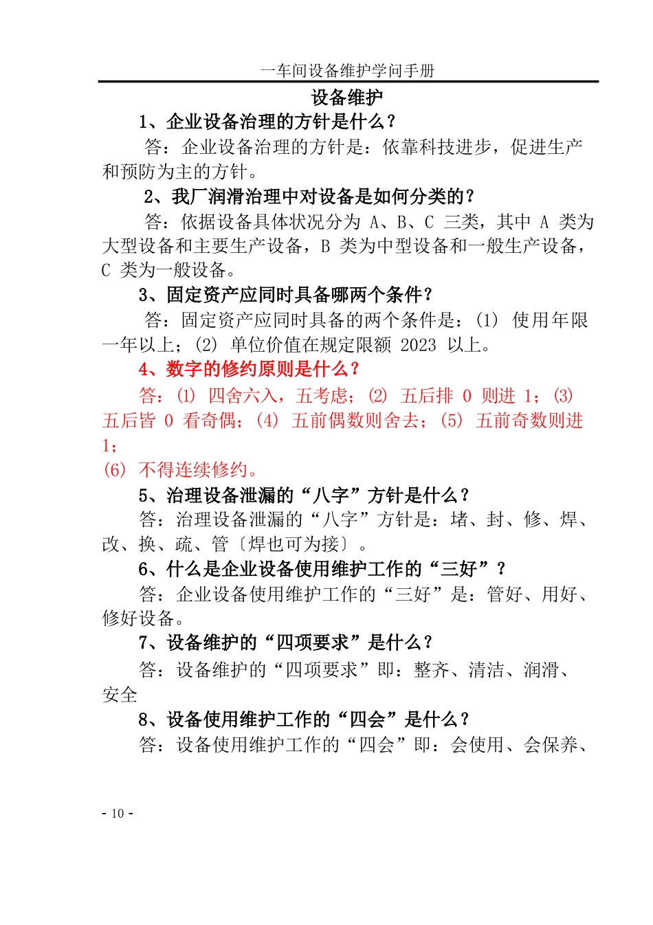 一车间设备维护学问手册-10-设备维护1、企业设备治理的方针是什么?答:企业设备治理的方针是:依靠科技进步,促进生产和预防为主的方针。2...