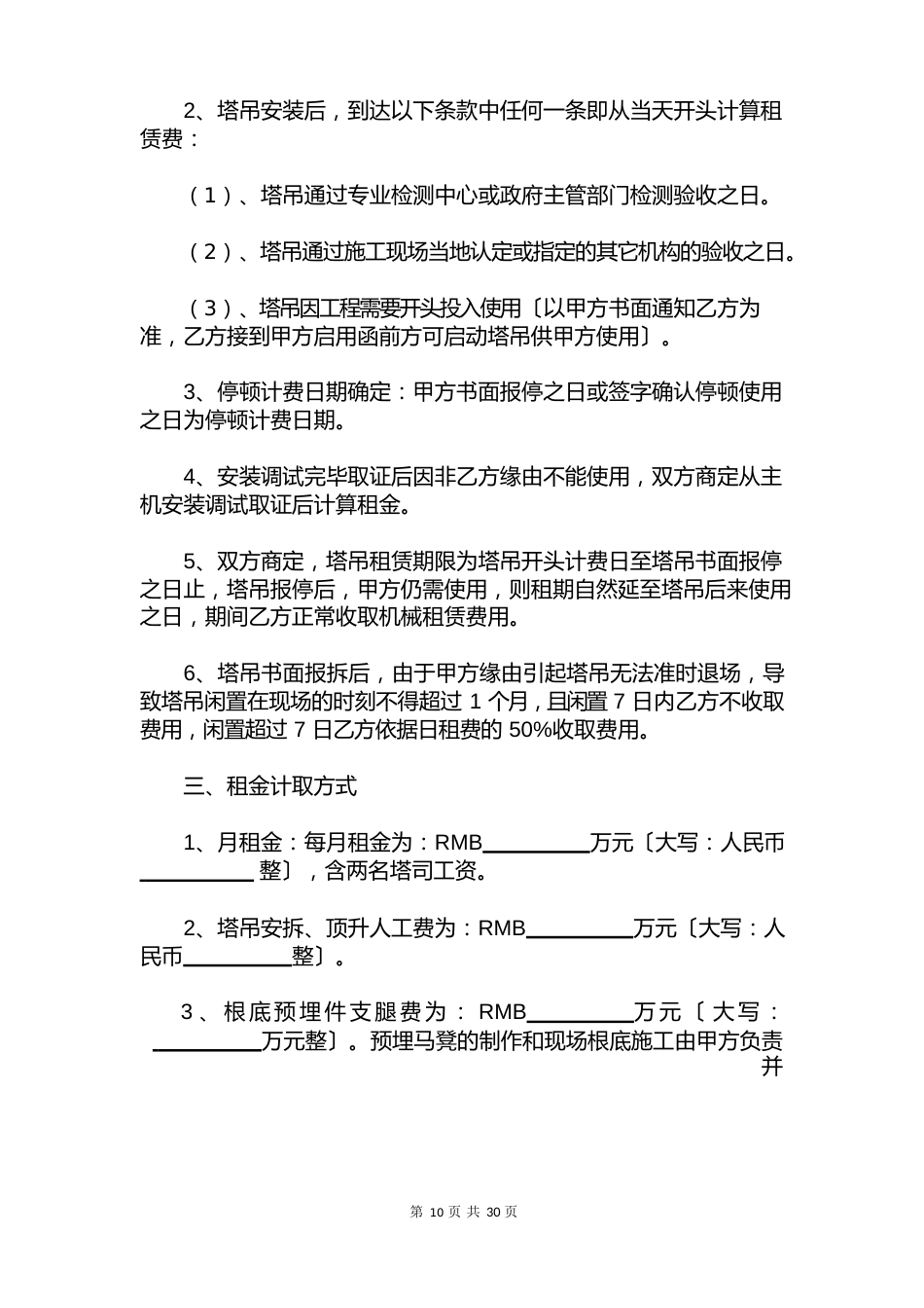 第10页共30页塔吊的租赁合同〔精选7篇〕塔吊的租赁合同第1篇因工程施工需要,甲方租赁乙方塔吊台投入到工程施工,为明确双方的责任、权利及...