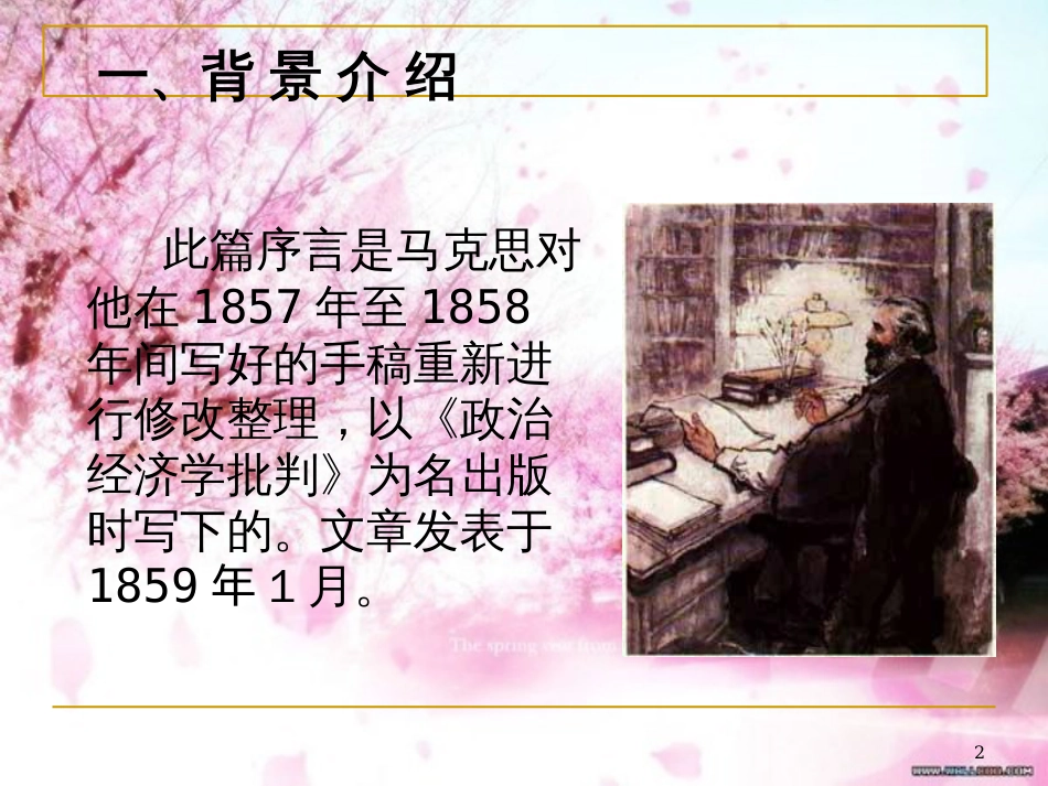 1《<政治经济学批判>序言》讲解2此篇序言是马克思对他在1857年至1858年间写好的手稿重新进行修改整理,以《政治经济学批判》为名出版时写下...