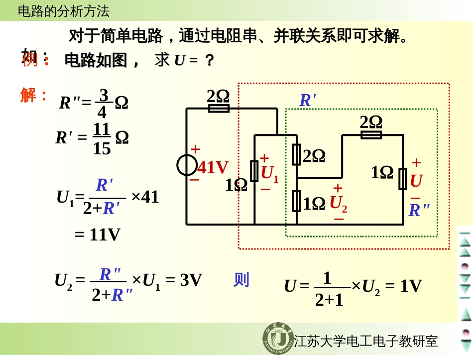 1江苏大学电工电子教研室电路的分析方法对于简单电路,通过电阻串、并联关系即可求解。如:R'R"例:电路如图电路如图,,求求UU==??解:R"=...
