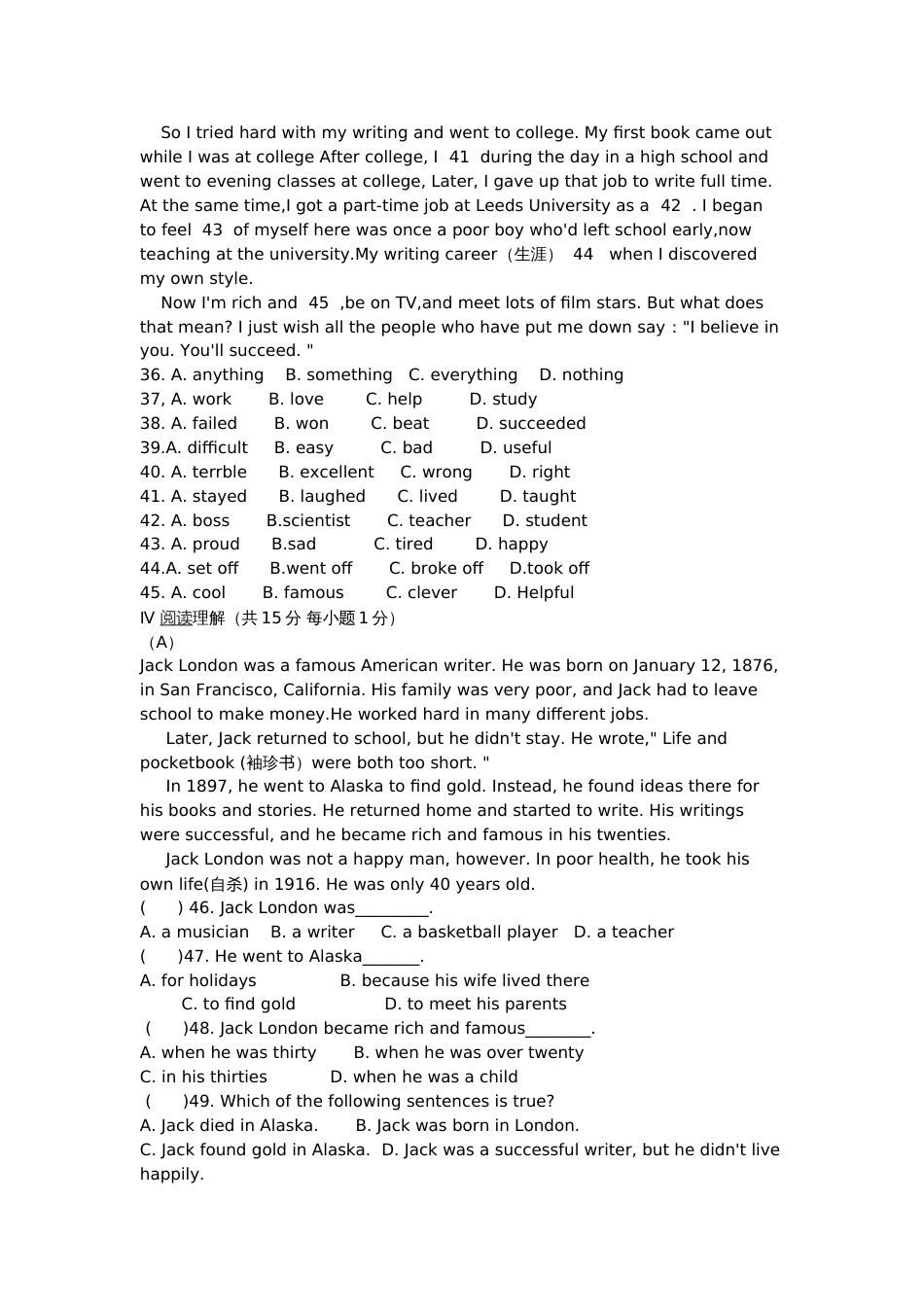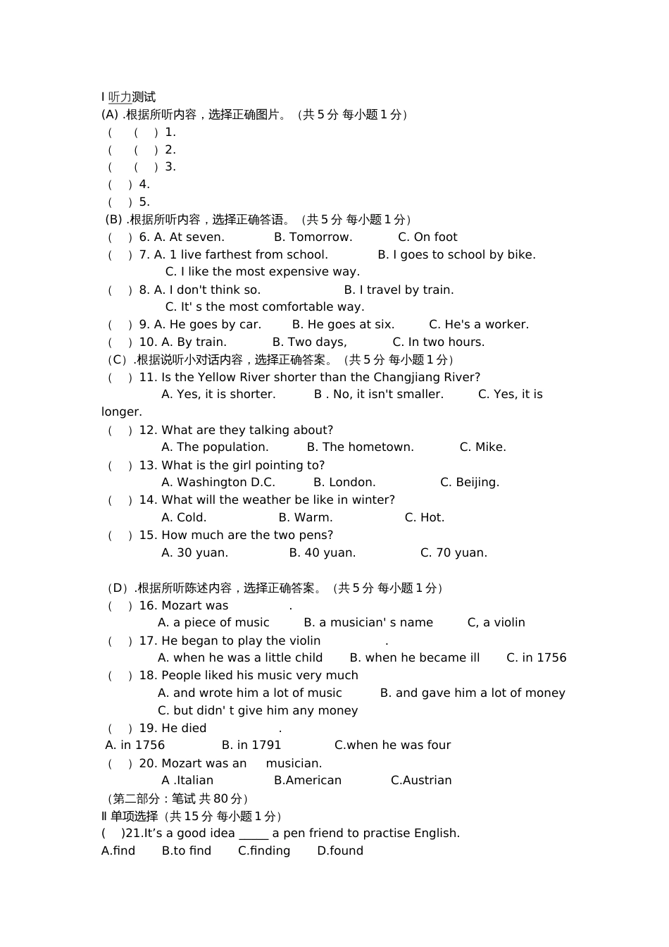 Ⅰ听力测试(A).根据所听内容,选择正确图片。(共5分每小题1分)(()1.(()2.(()3.()4.()5.(B).根据所听内容,选择正确答语。(...