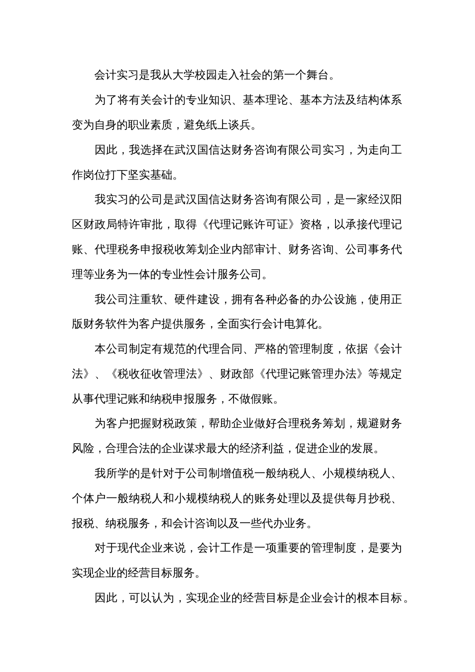 会计实习是我从大学校园走入社会的第一个舞台。为了将有关会计的专业知识、基本理论、基本方法及结构体系变为自身的职业素质,避免纸上谈兵...