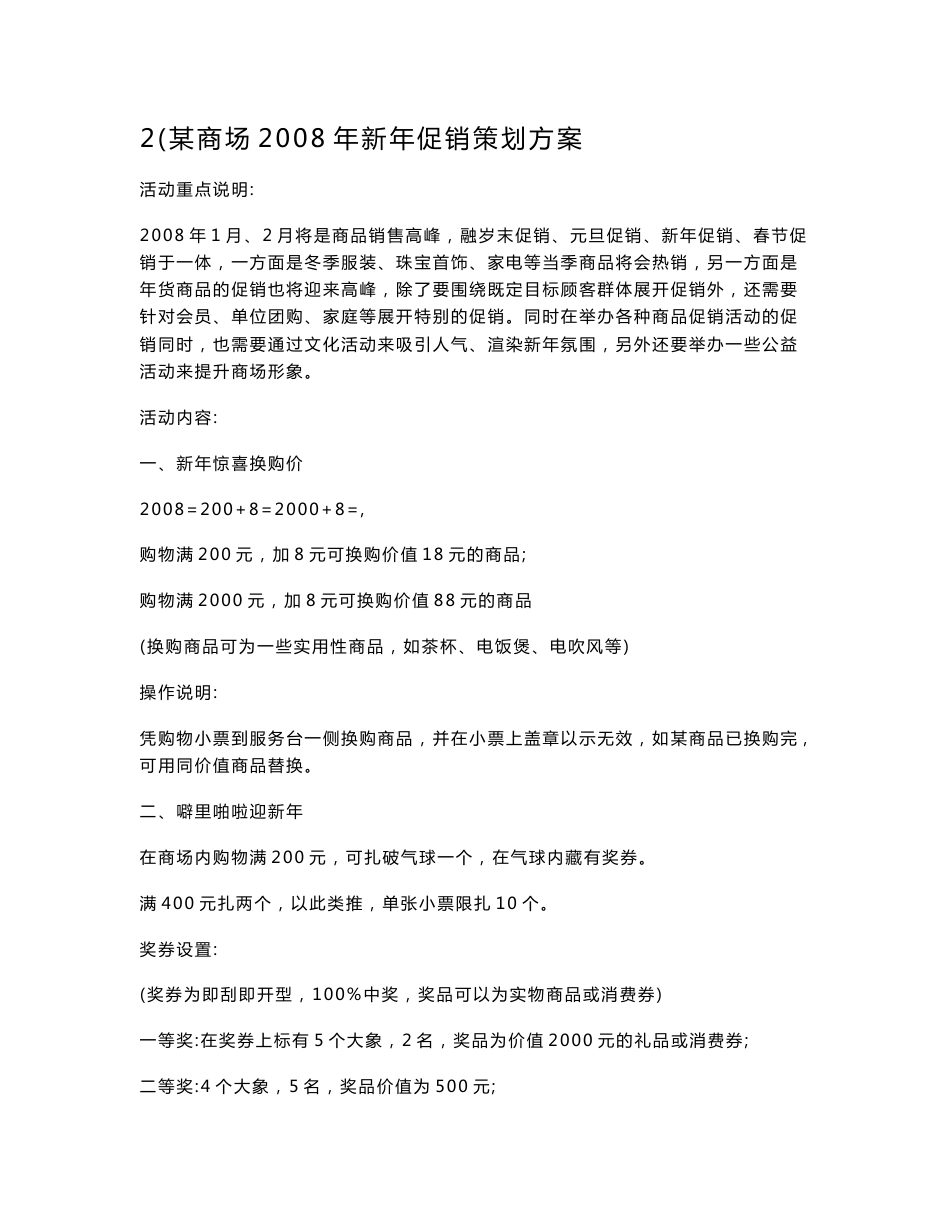 2(某商场2008年新年促销策划方案活动重点说明:2008年1月、2月将是商品销售高峰,融岁末促销、元旦促销、新年促销、春节促销于一体,一方面...