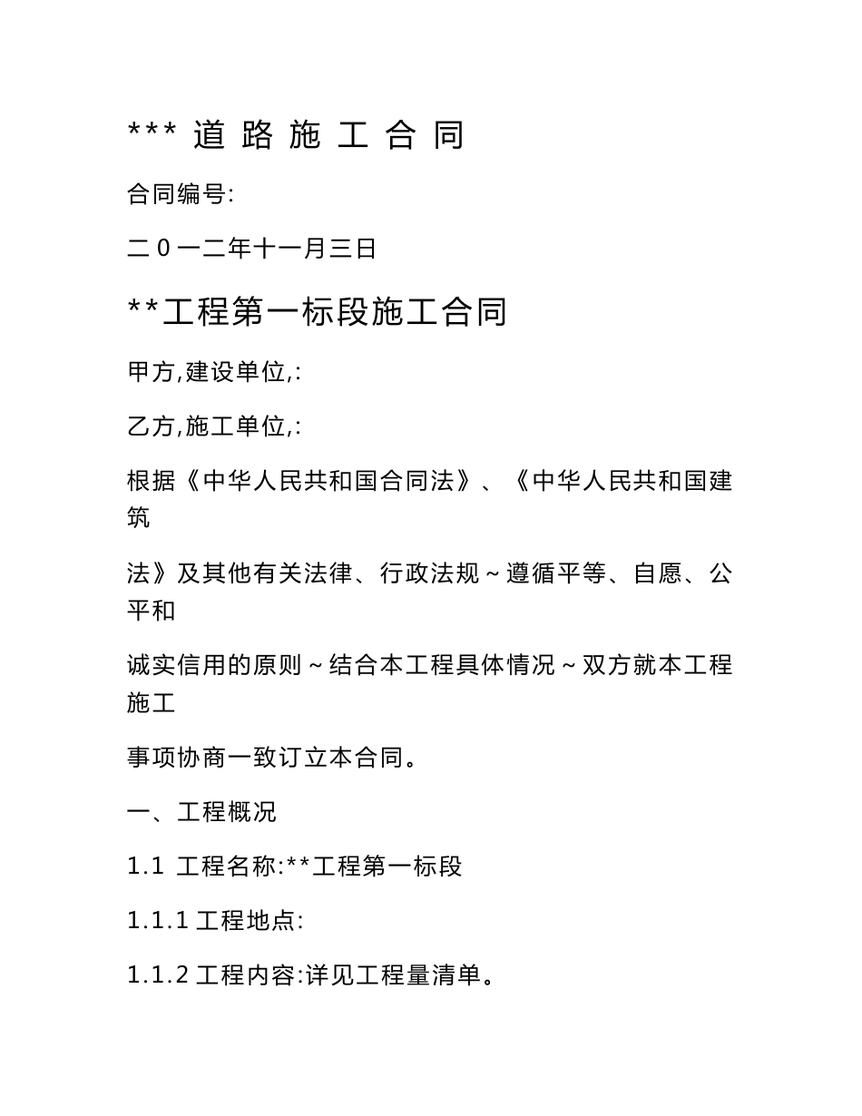 ***道路施工合同合同编号:二0一二年十一月三日**工程第一标段施工合同甲方,建设单位,:乙方,施工单位,:根据《中华人民共和国合同法》、《中...