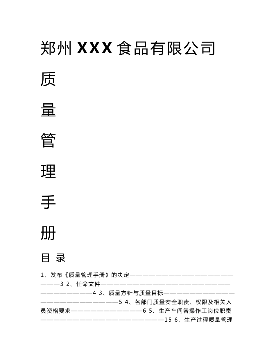 郑州XXX食品有限公司质量管理手册目录1、发布《质量管理手册》的决定———————————————————32、任命文件————————...