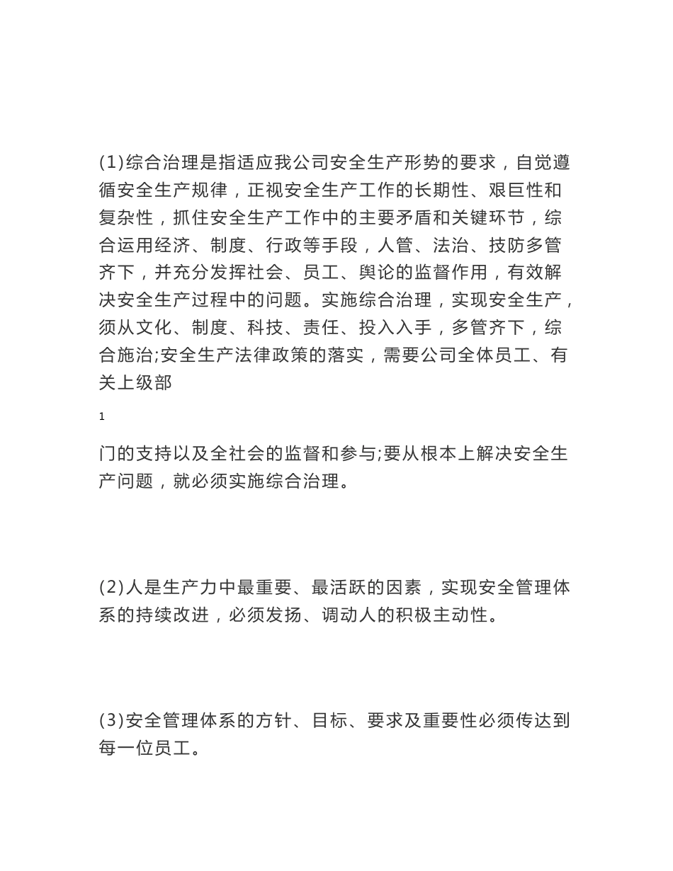 第一章安全生产方针和目标一、公司的安全生产方针:安全第一,预防为主;综合治理,全员参与。1、安全第一,预防为主(1)在生产经营活动中,在...