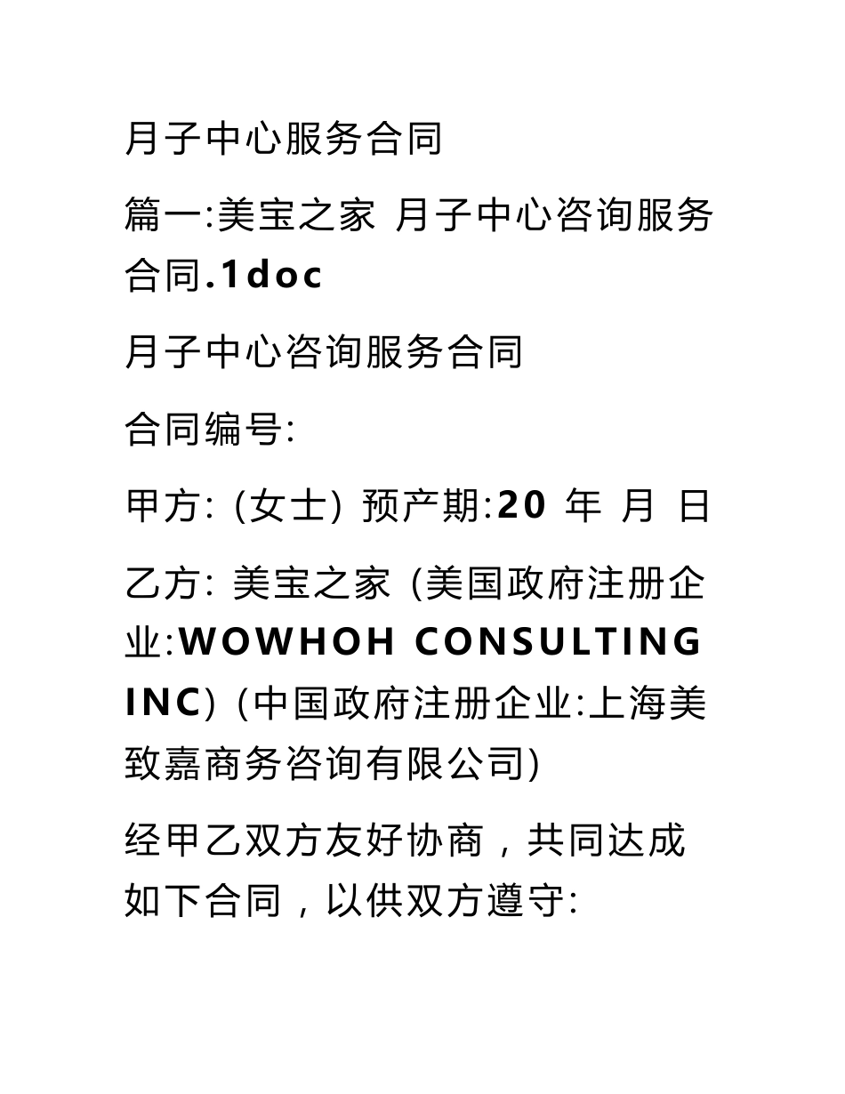 月子中心服务合同篇一:美宝之家月子中心咨询服务合同.1doc月子中心咨询服务合同合同编号:甲方:(女士)预产期:20年月日乙方:美宝之家(美国政...