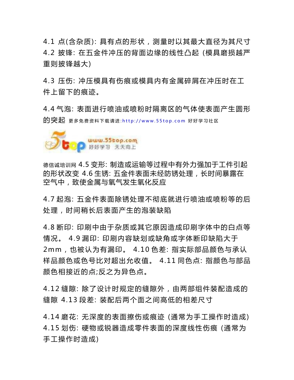 德信诚培训网五金冲压件检验作业指导书1.目的为了在对五金冲压件进行外观检查时提供客观依据,使全公司的外观判定标准得到统一,同时缩小与...