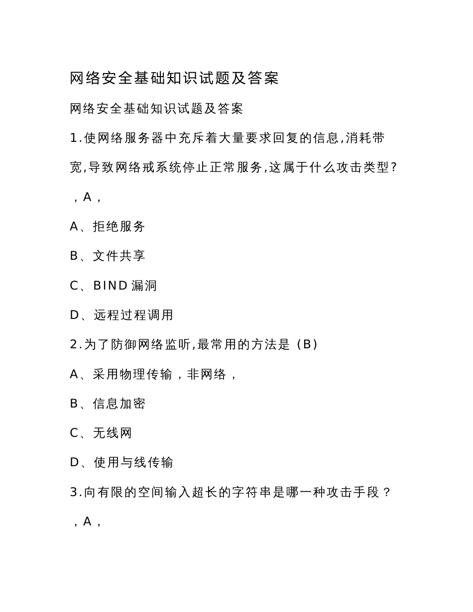 网络安全基础知识试题及答案网络安全基础知识试题及答案1.使网络服务器中充斥着大量要求回复的信息,消耗带宽,导致网络戒系统停止正常服务,...